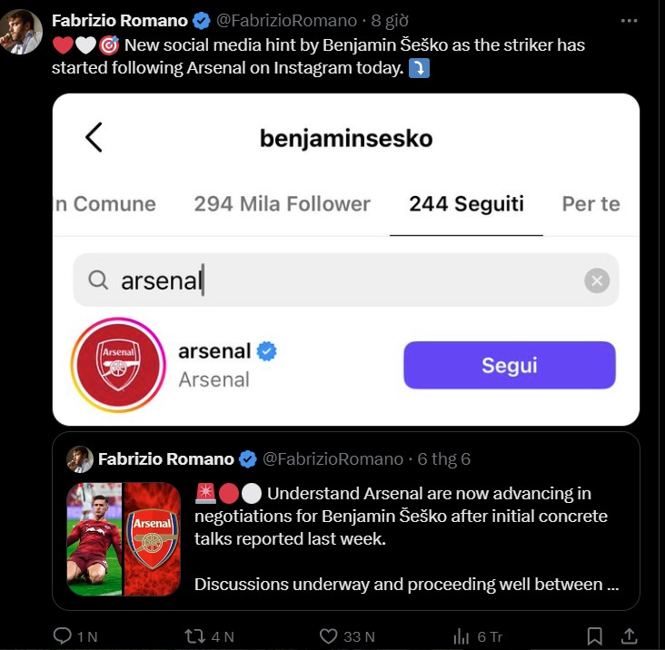 Dấu hiệu rõ ràng nhất vừa xuất hiện khi chuyên gia chuyển nhượng Fabrizio Romano phát hiện Sesko đã bắt đầu theo dõi tài khoản Instagram chính thức của Arsenal. Với 297.000 người theo dõi và chỉ theo dõi 244 tài khoản, việc Sesko chọn theo dõi Arsenal đã lập tức thu hút sự chú ý từ người hâm mộ và giới truyền thông, trong bối cảnh thương vụ chưa được công bố chính thức. Điều này tạo ra sự phấn khích rất lớn đối với người hâm mộ “Pháo thủ”, những người đang khao khát một tiền đạo đẳng cấp.